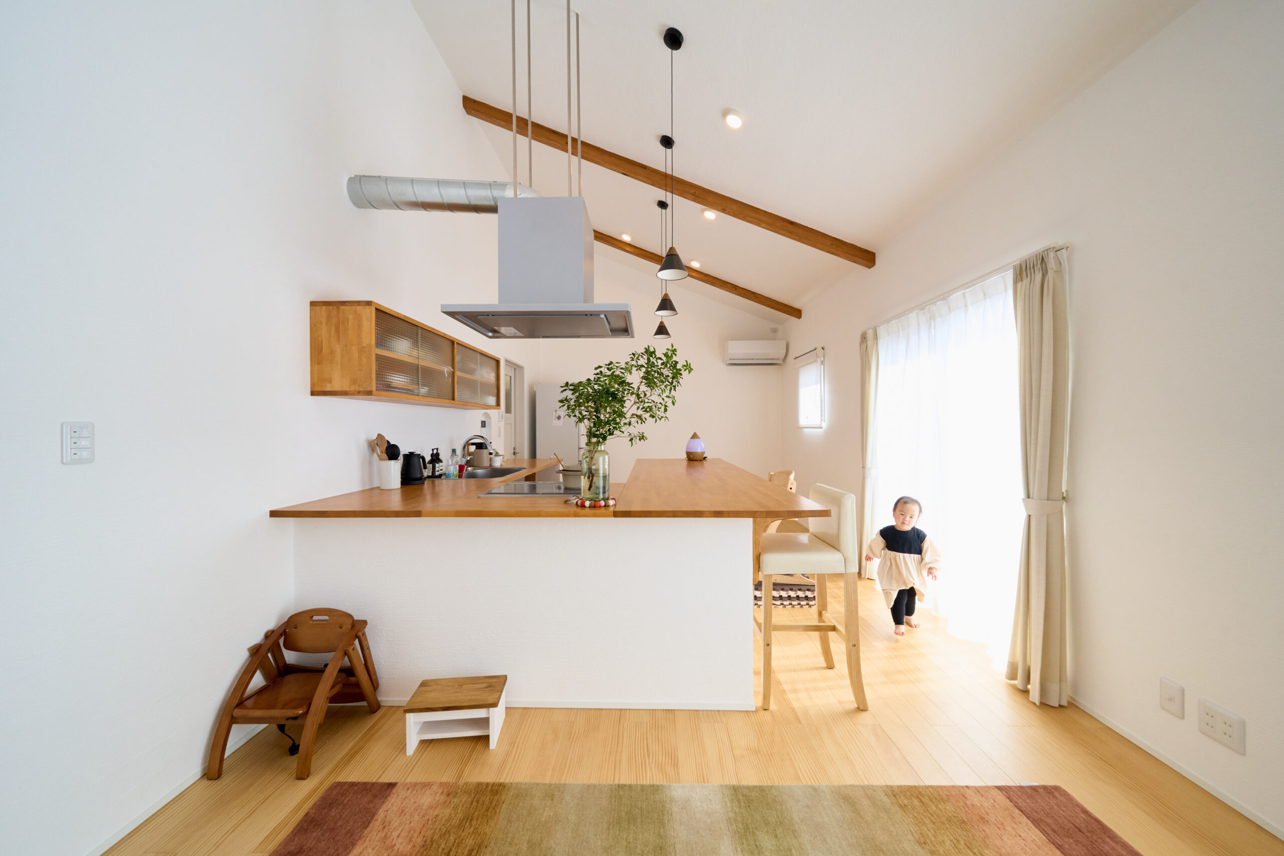 壁やドアをなくし、キッチン・ダイニング・リビングを一体化することで、視線が奥まで通り抜け、空間のつながりを感じられます。 - 吹き抜けや勾配天井の活用