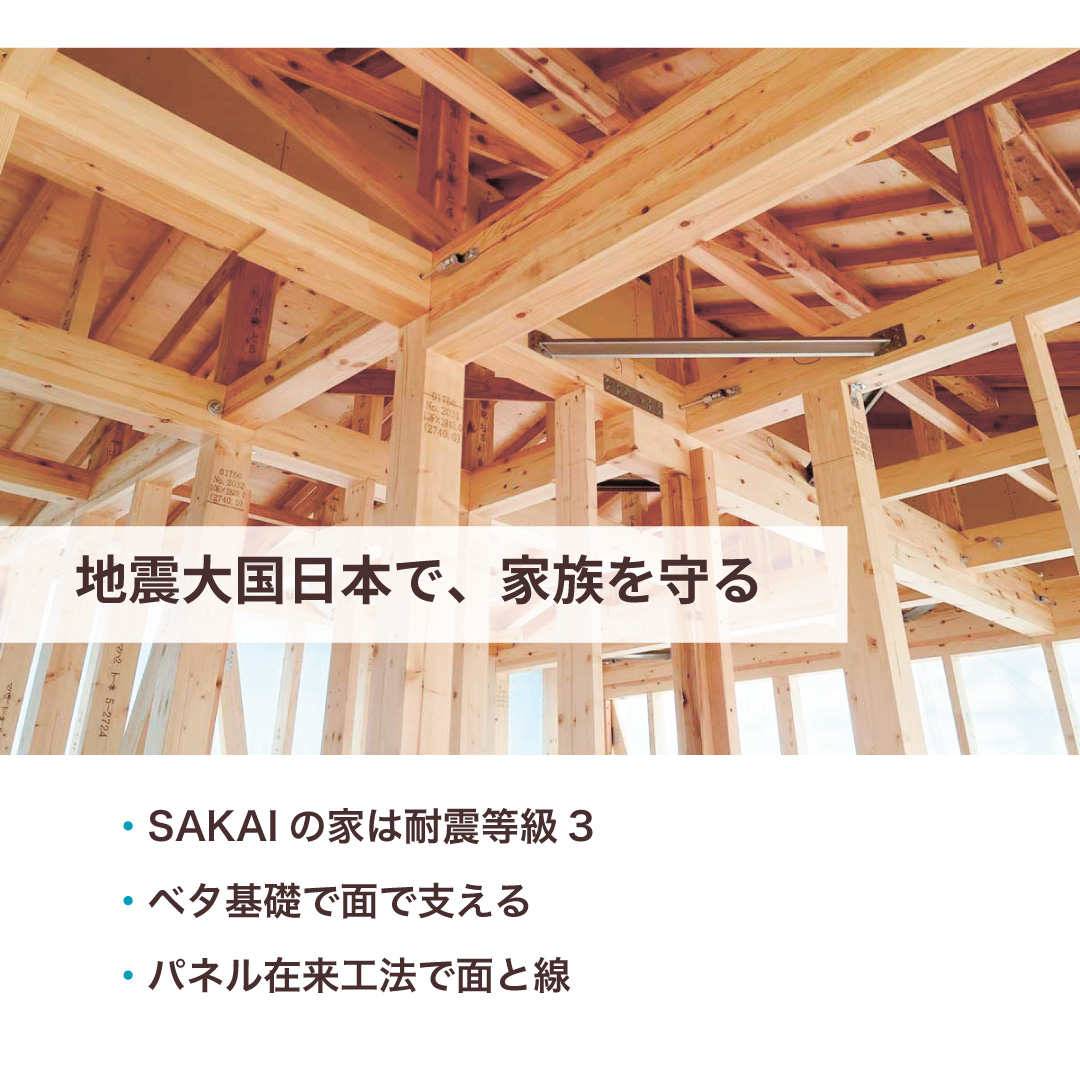 SAKAIの家(旧サラダホーム)の住宅は、安全・安心を守るために耐震性能にもこだわっています。もしものときに命を奪ってしまう家ではなく、住む方を守る家であることを大切にしています。