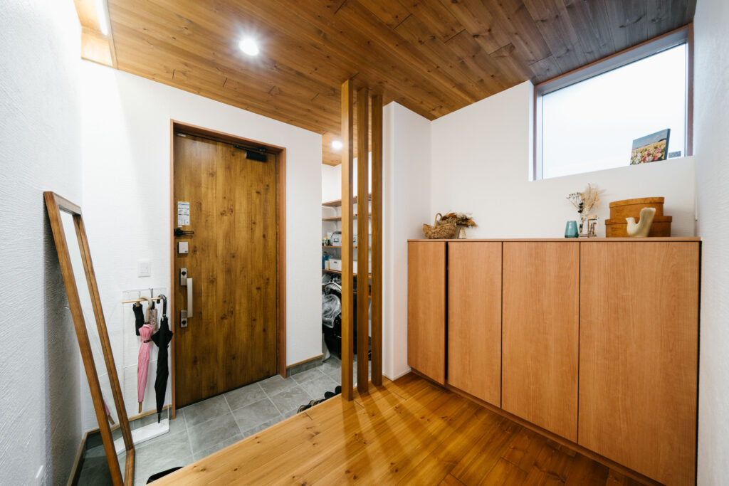 贅沢な広さの玄関ホールには、大容量のシューズクロークを完備。これから生まれてくるお子様のベビーカーを置くのにも充分なスペースがあります。玄関とリビングを仕切るリビングドアには透明ガラスを採用し、空間がつながることで視覚的に広く感じられます。