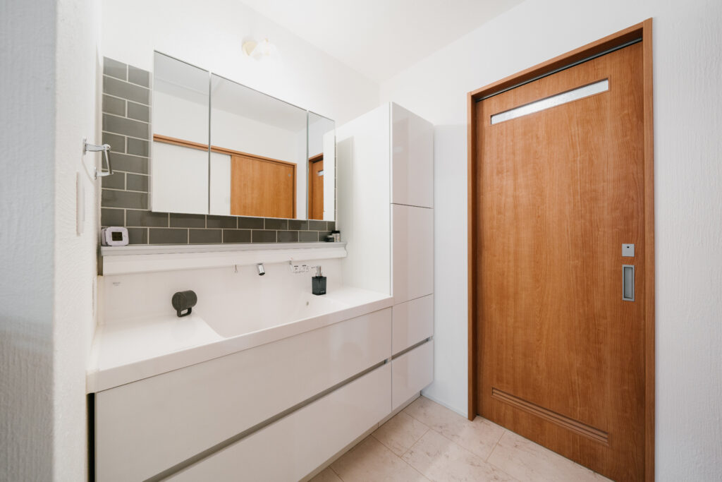 住まいの中心には、リビングをできる限り広く設計。勾配天井の効果で解放感があり、家族が自然と集まる居心地の良い場所になりました。主寝室や洗面室、子ども部屋など、それぞれの空間はリビングを囲むように配置し、各空間のドアは一般的なものよりも背の高いハイドアにすることで、スタイリッシュな印象です。