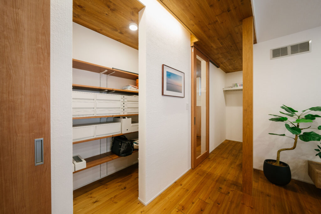 特徴的なのが、木と漆喰のバランスです。床、柱、扉にくわえ、ウォークインクローゼットからリビングを抜けてキッチンまでの天井に木を使っていて、やわらかすぎないあたたかさを演出。随所に取り入れた間接照明によって木や漆喰が引き立ち、空間に奥行きをもたらします。