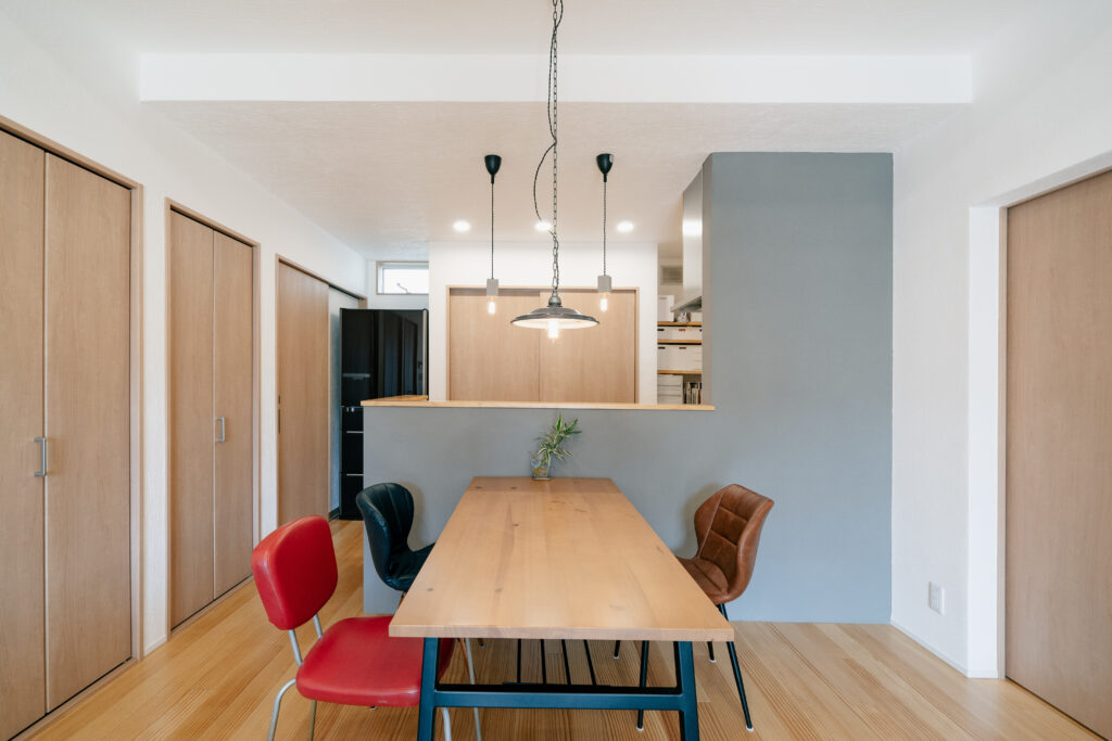 淡いトーンのアクセントクロスが、木の温もりを引き立てる上品なダイニング。