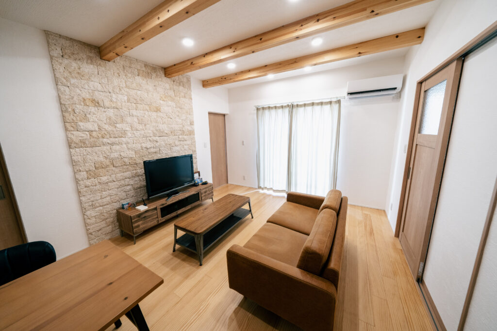 梁の見える天井と石貼りの壁が、温もりと上質さを両立させる印象的な空間。
