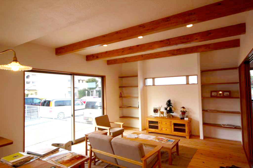空間の広がりを出すために、ワイド巾の掃き出し窓天井に化粧梁を現しています。 壁面に造作の本棚を設置し、いつでも読書を楽しむことができます。