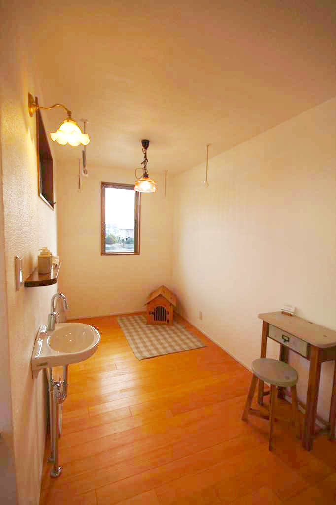 階段を上がると約4帖ほどの空間が現れます。 書道を趣味としている奥様のご希望で小さな洗面を設置。 雨の日は、部屋干しができる洗濯スペースとしてもご利用いただけるご提案になっています。