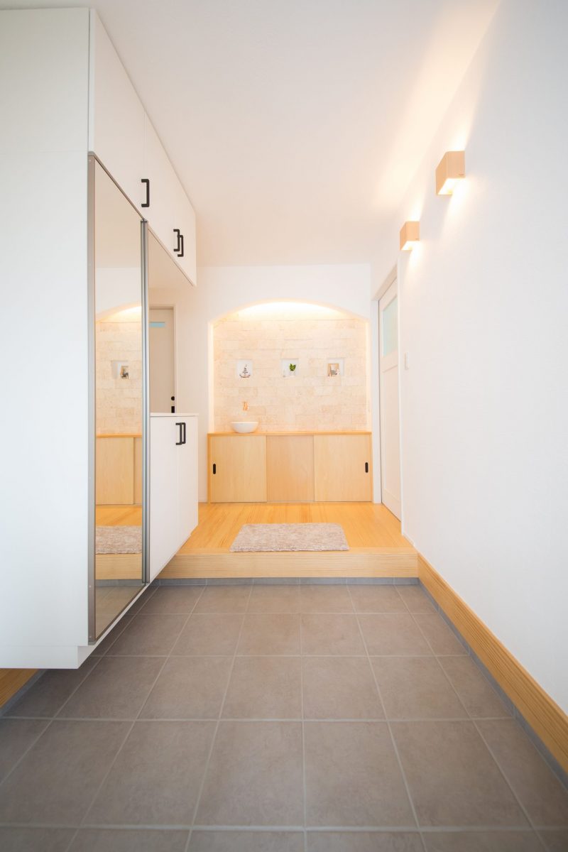 閑静な住宅地に建つ真っ白なしっくいの家。 プライバシーの保たれたL字型の間取りで 安心の住まい。造作家具で統一感があり、 木の温もりが存分に感じられる室内の 空間で癒しのひとときを演出します。