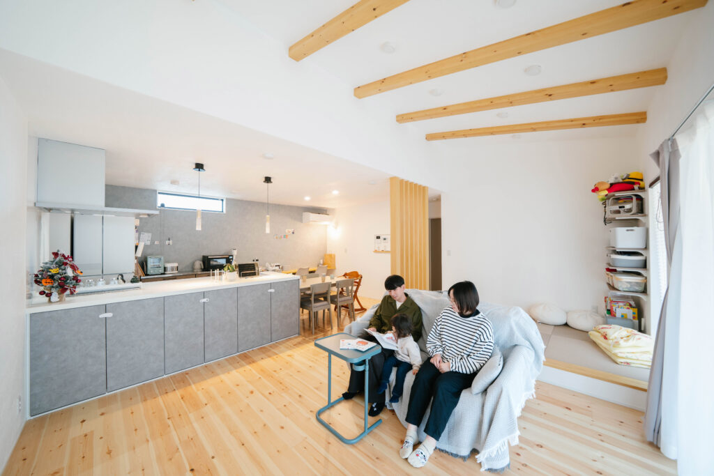 住まいの中心となるLDKは、床や柱の木のぬくもりに癒やされながらも、キッチンに採用したスタイリッシュなグレーカラーが空間の印象を引き締めます。また、リビングに取り入れた畳コーナーは、柱によって空間の独立感を持たせつつ、開放感はそのまま保たれています。