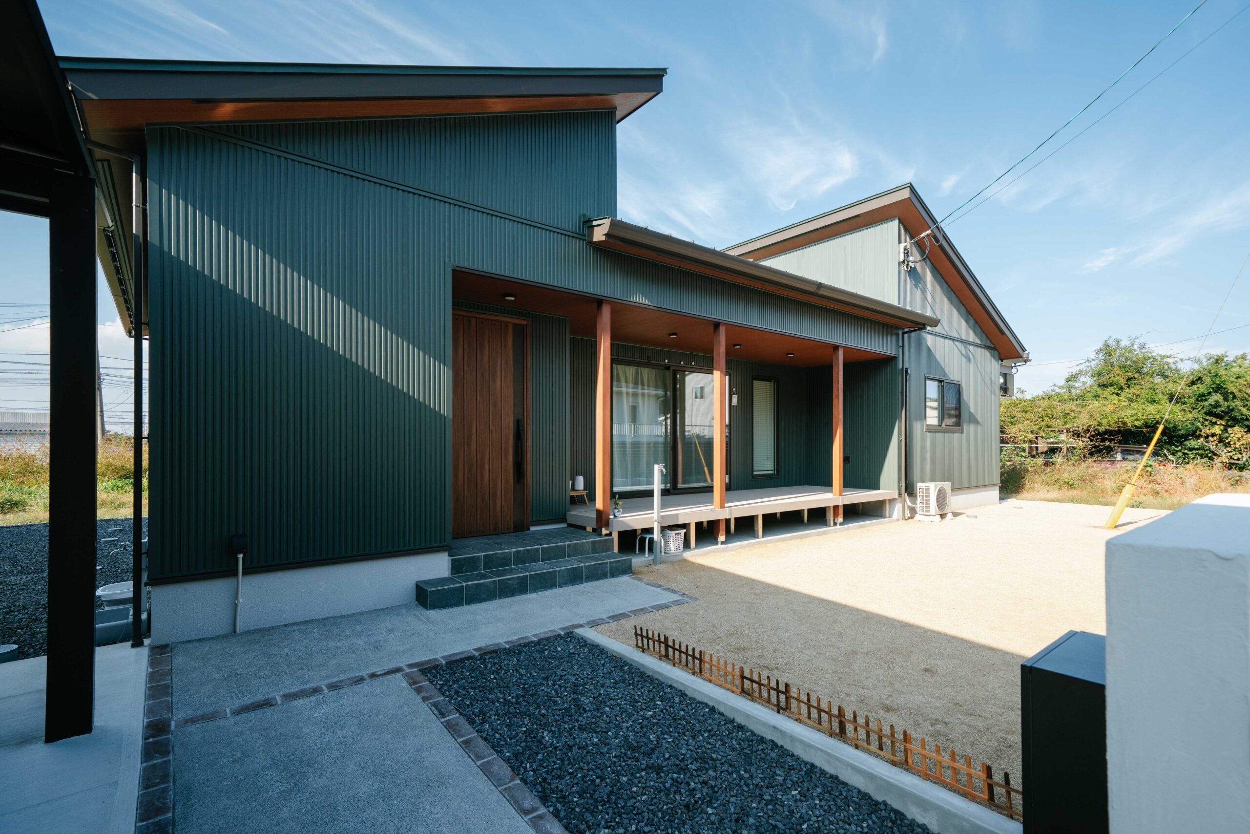 存在感があるモスグリーンの外壁がセンスあふれる平屋建て。ゆとりあるガレージや広々ウッドデッキなど、憧れが詰まっています。