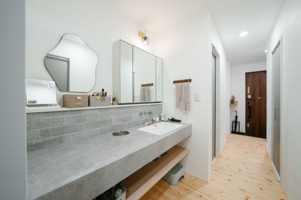 造作の洗面化粧台は独立空間に。スタイリッシュなカラーと素材感によって、ホテルライクな印象です。