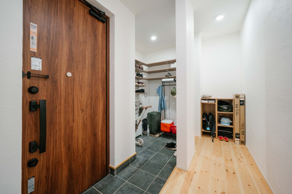 玄関のシューズラックの下も収納スペースに。大きなものを置いても圧迫感がありません。