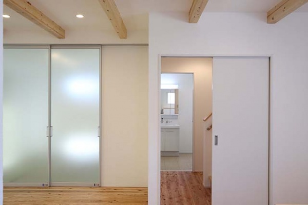 子供達が裸足で駆けまわったり、床に寝そべったり出来る肌触りのいい無垢材を使いたい!というご要望に杉の浮造りフローリングを採用。