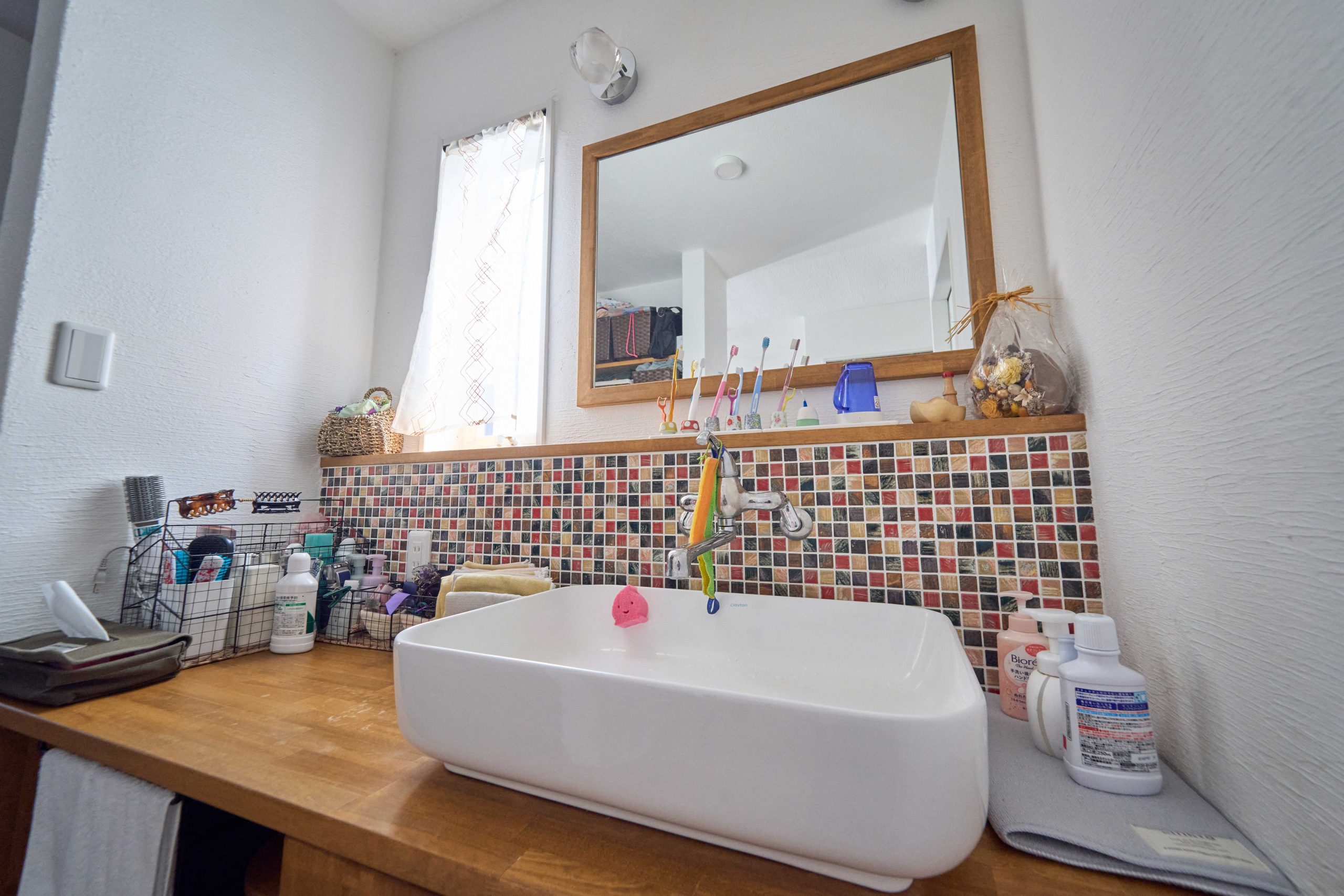 家族全員が使用する洗面台は、タイルを明るい色で揃えて